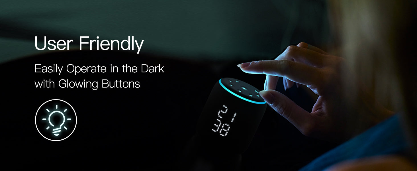 ● 𝙎𝙞𝙢𝙥𝙡𝙚 𝘾𝙤𝙣𝙩𝙧𝙤𝙡 𝙀𝙫𝙚𝙣 𝙖𝙩 2 𝘼𝙈: No more fumbling in the dark—glow-in-dark buttons, fully dimmable display, and 7-color night light make nighttime control easy and stress-free